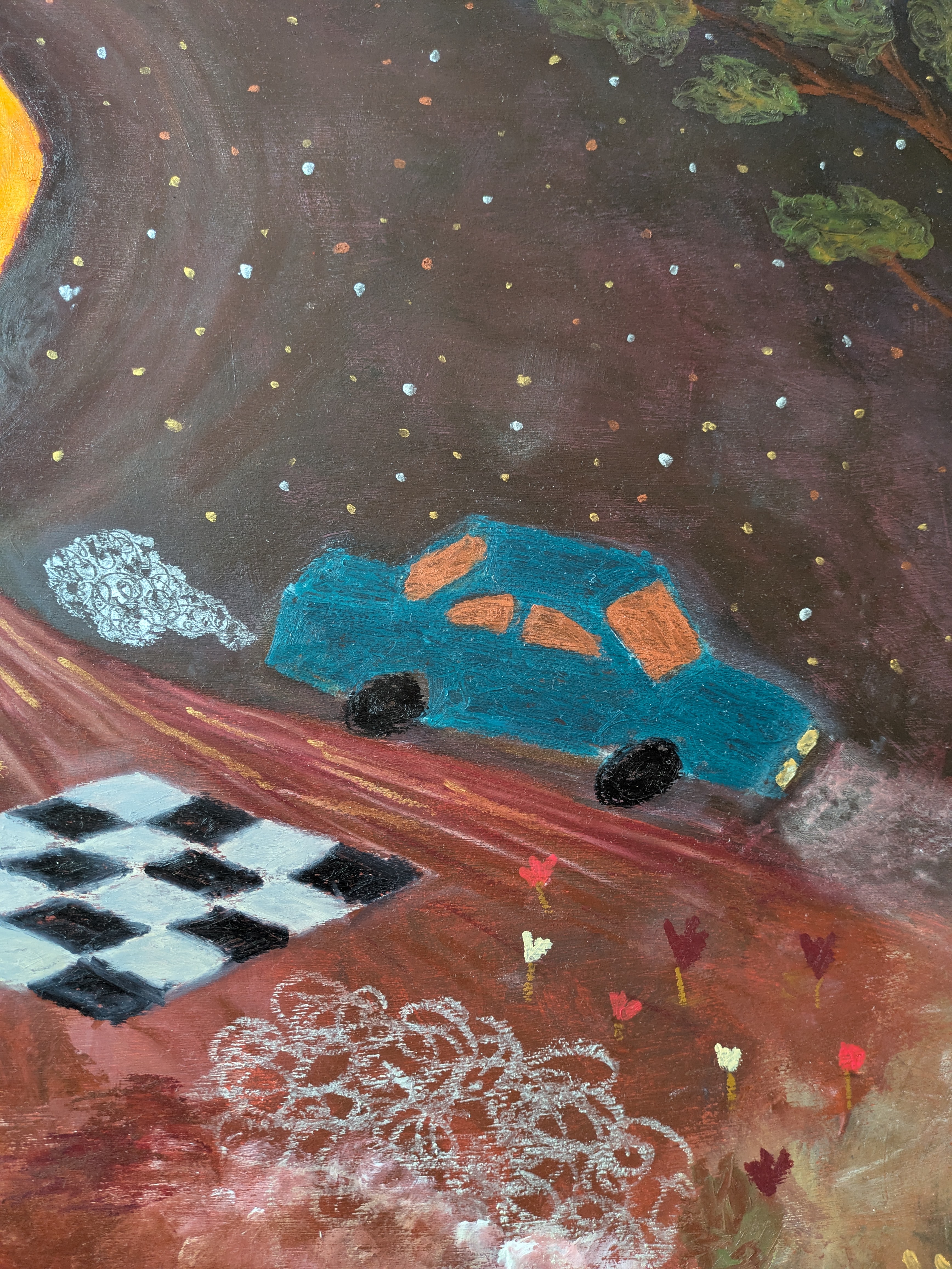 My works in this show move between playfulness and quiet unease, with layered surfaces, symbolic figures, and embroidered elements that hint at open-ended narratives. I like when things feel slightly off – like a memory or a dream that doesn’t fully settle.